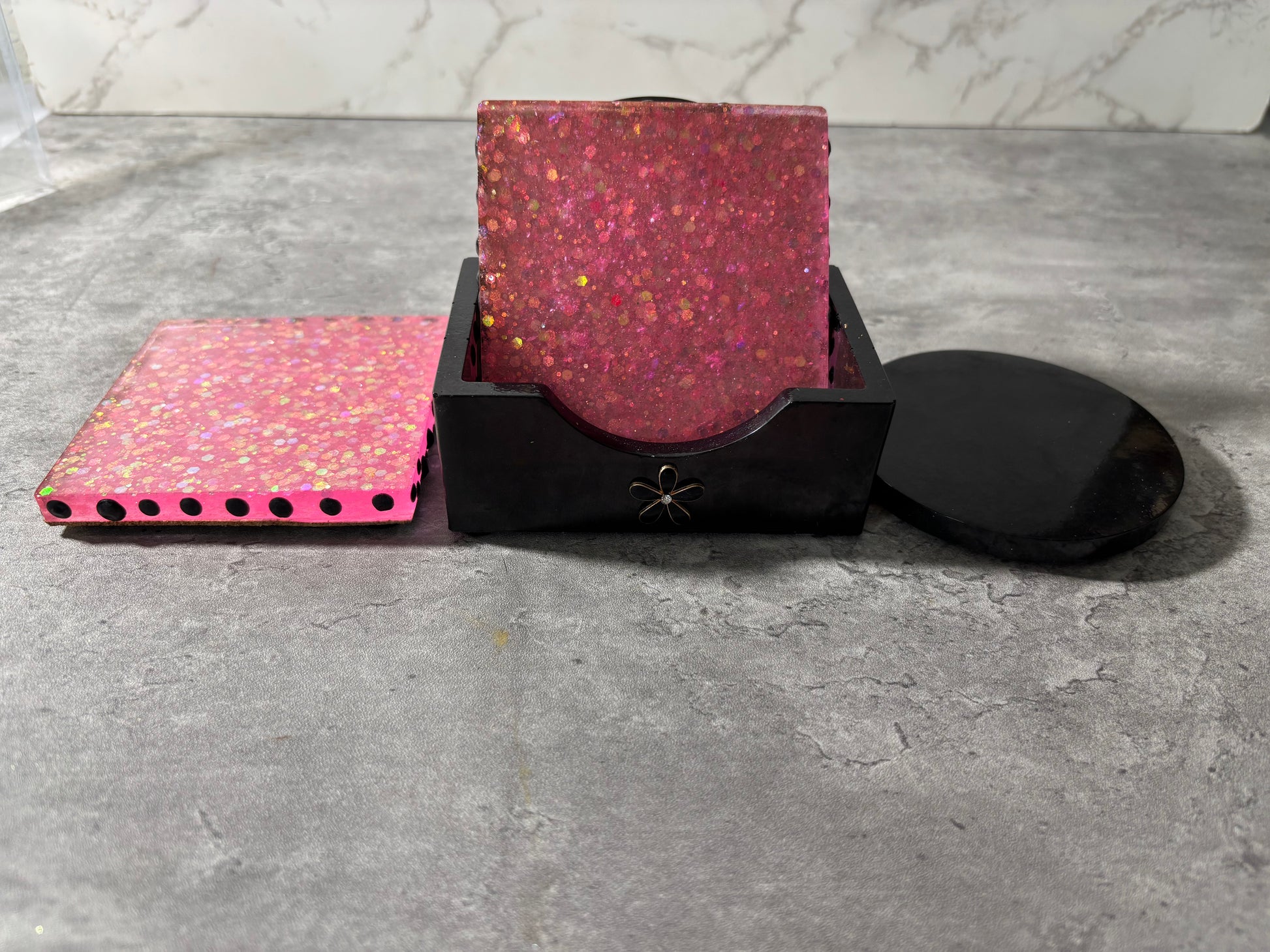 Discover the beauty and uniqueness of our handmade resin coasters. Made with vibrant pink and black colors, these five piece coasters will add a touch of style and protection to any table. Crafted with care and love, they make the perfect addition to any home decor.