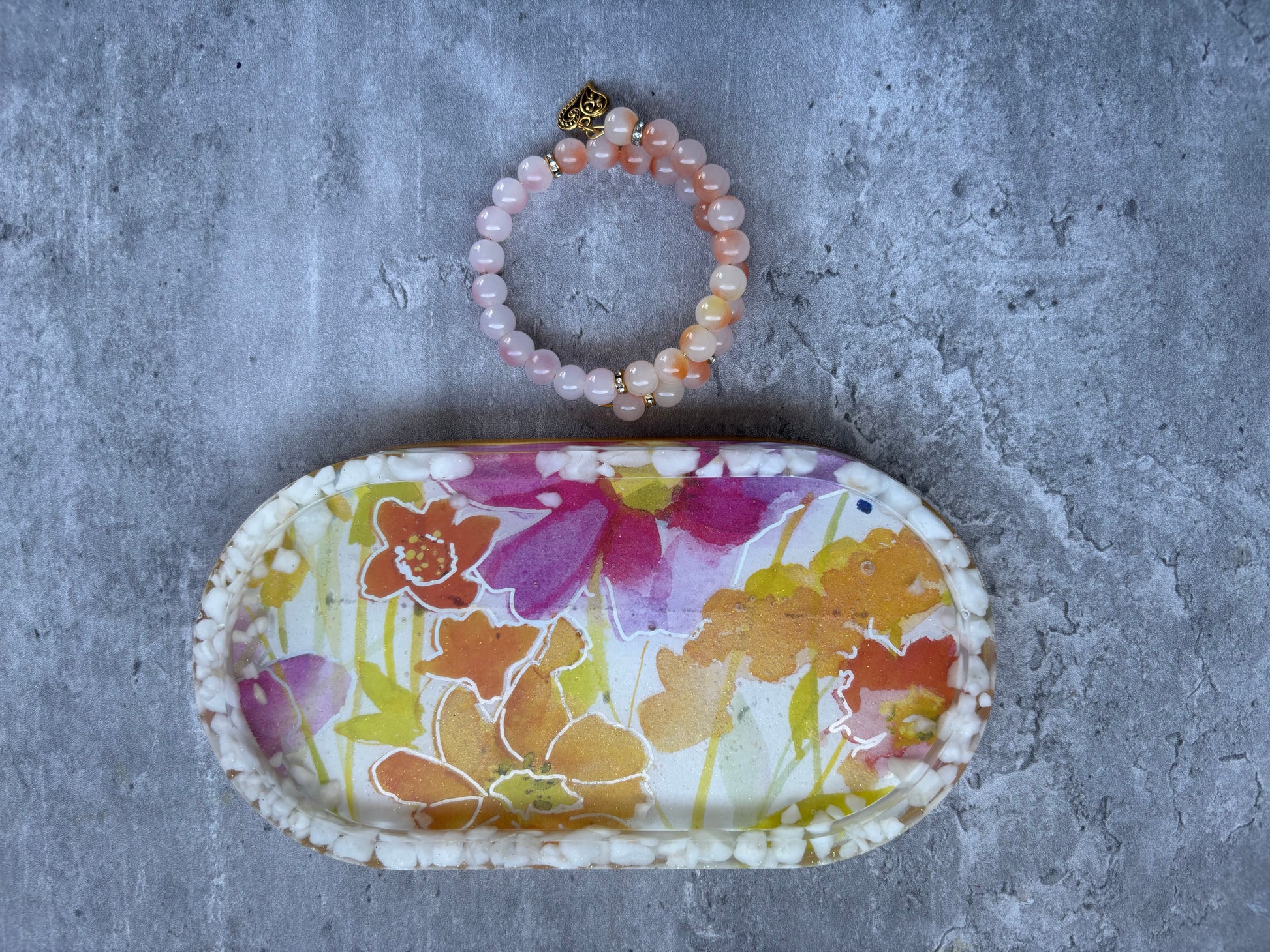 Indulge in the beauty of the Handmade Trinket Tray & Beaded Set! This stunning 2-piece set is made of high-quality resin, and features a delicate flower design on an elegant oval shape. Keep your trinkets safe and add a touch of charm to your space with this one-of-a-kind set. Perfect for any lover of handmade, unique pieces!